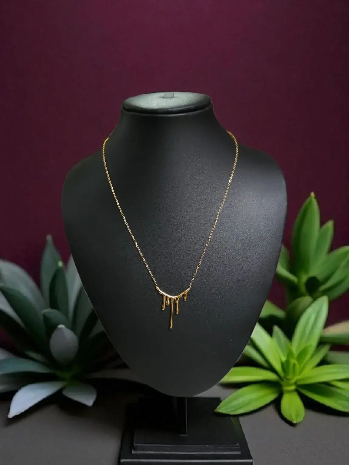 Make a bold statement with this golden melting pendant designed in a fluid, artistic form that symbolizes elegance and individuality. The smooth golden finish is not only eye-catching but also anti-tarnish