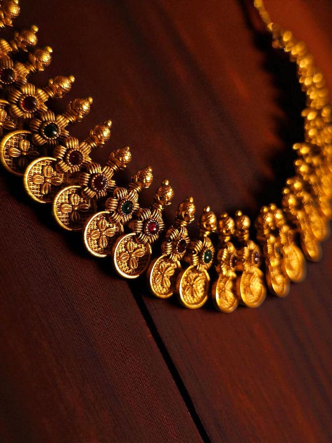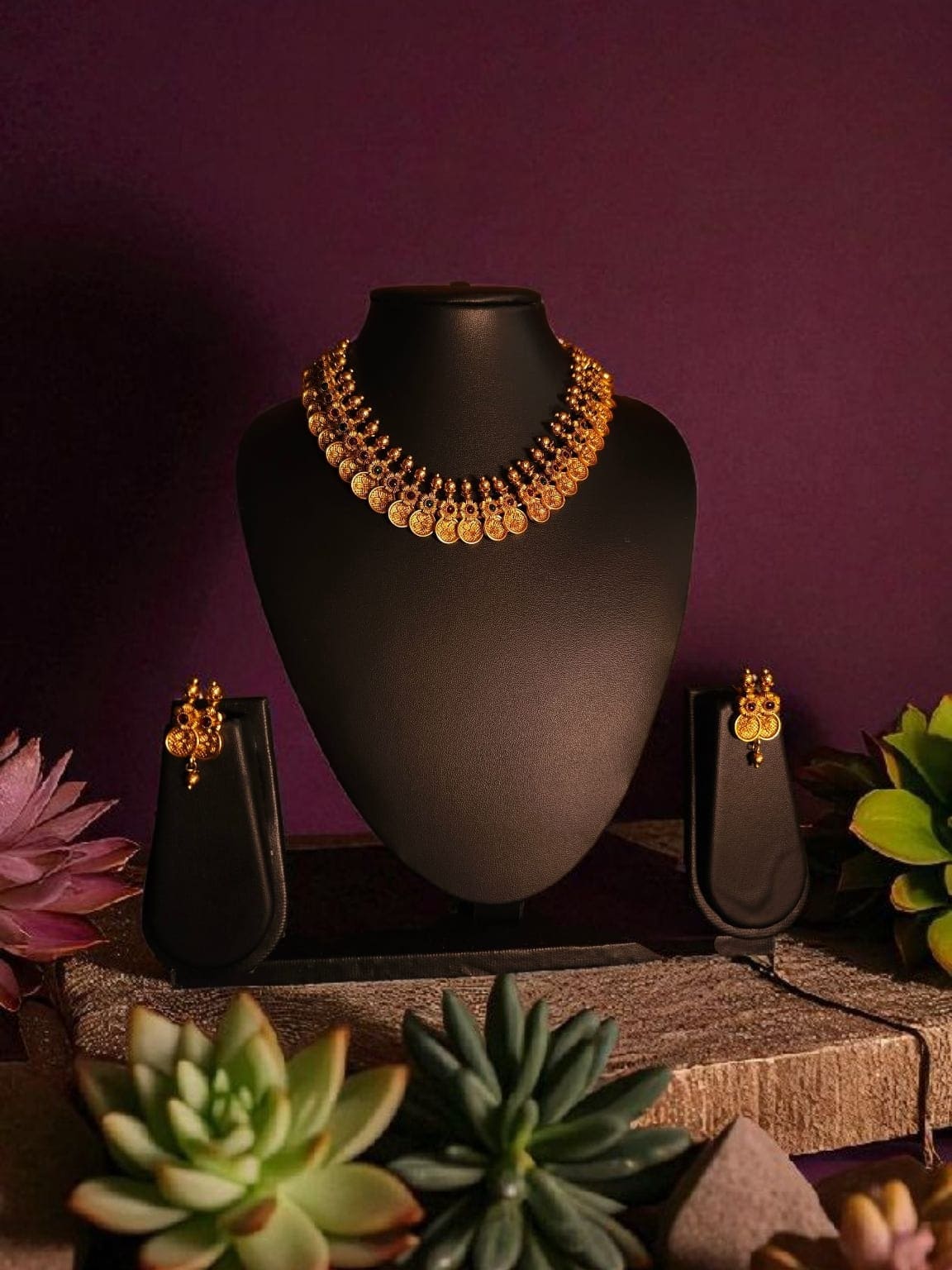 Step into tradition with this Kaashumala heavy necklace set, a timeless piece inspired by classic South Indian jewellery. Featuring intricate coin-style motifs and a bold, regal design, this set is crafted to bring out your inner goddess.