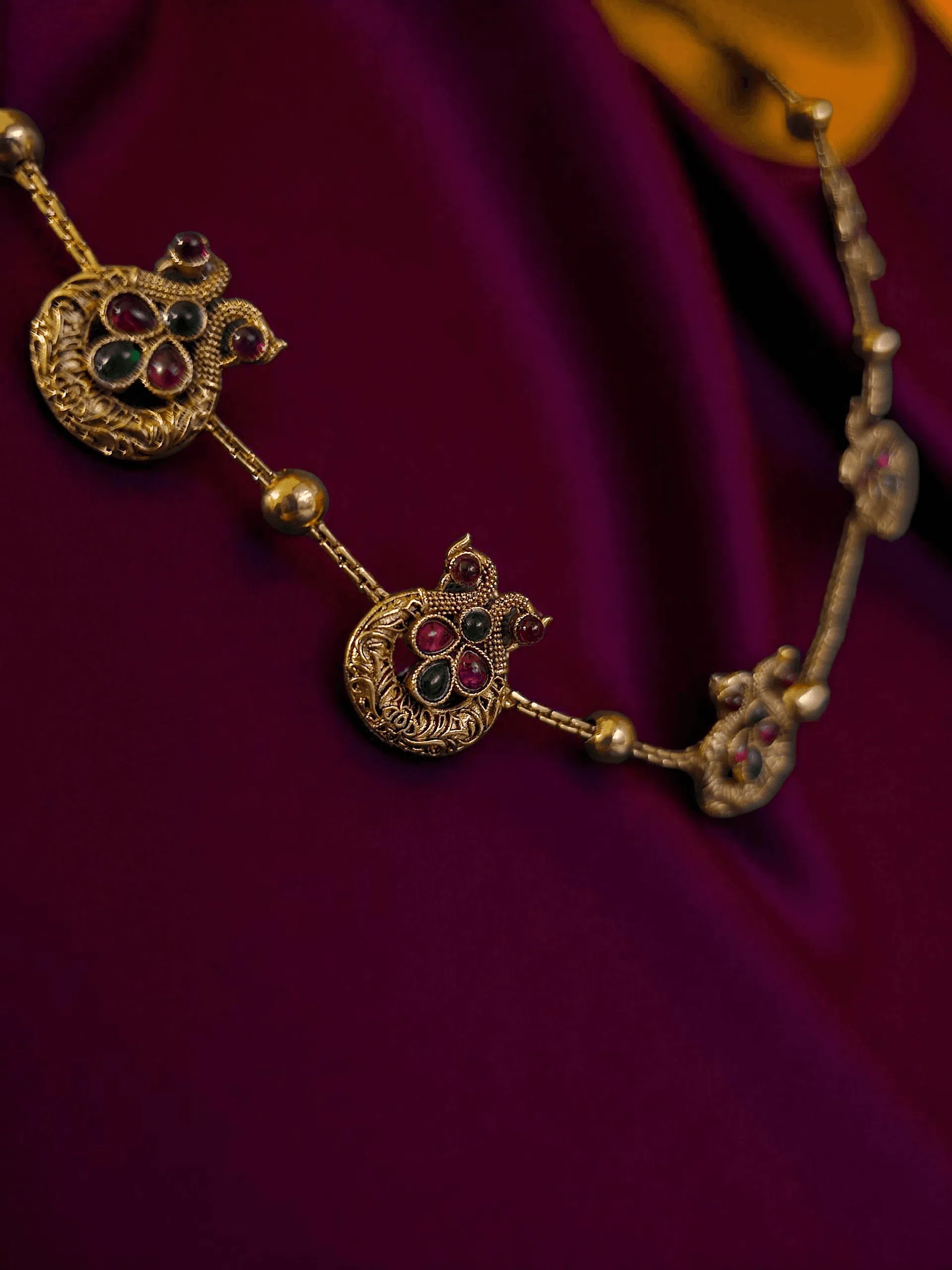 Delicate and graceful, this jewellery set features beautifully crafted round floral motifs in peacock design, embellished with sparkling stones for a subtle yet elegant look. The necklace is perfectly paired with matching earrings, making it a versatile choice for festive wear, weddings, or casual ethnic styling.