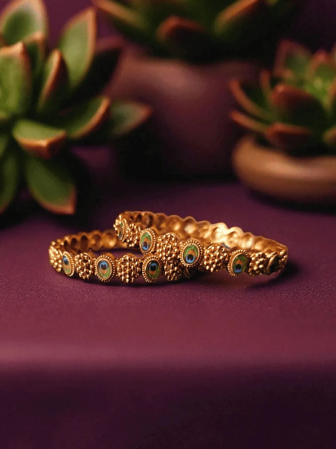 Add a touch of elegance and nature-inspired beauty with this peacock feather imprint bangle. Featuring a detailed peacock feather design, this bangle combines traditional charm with contemporary style, making it perfect for casual wear, festive occasions, or gifting.