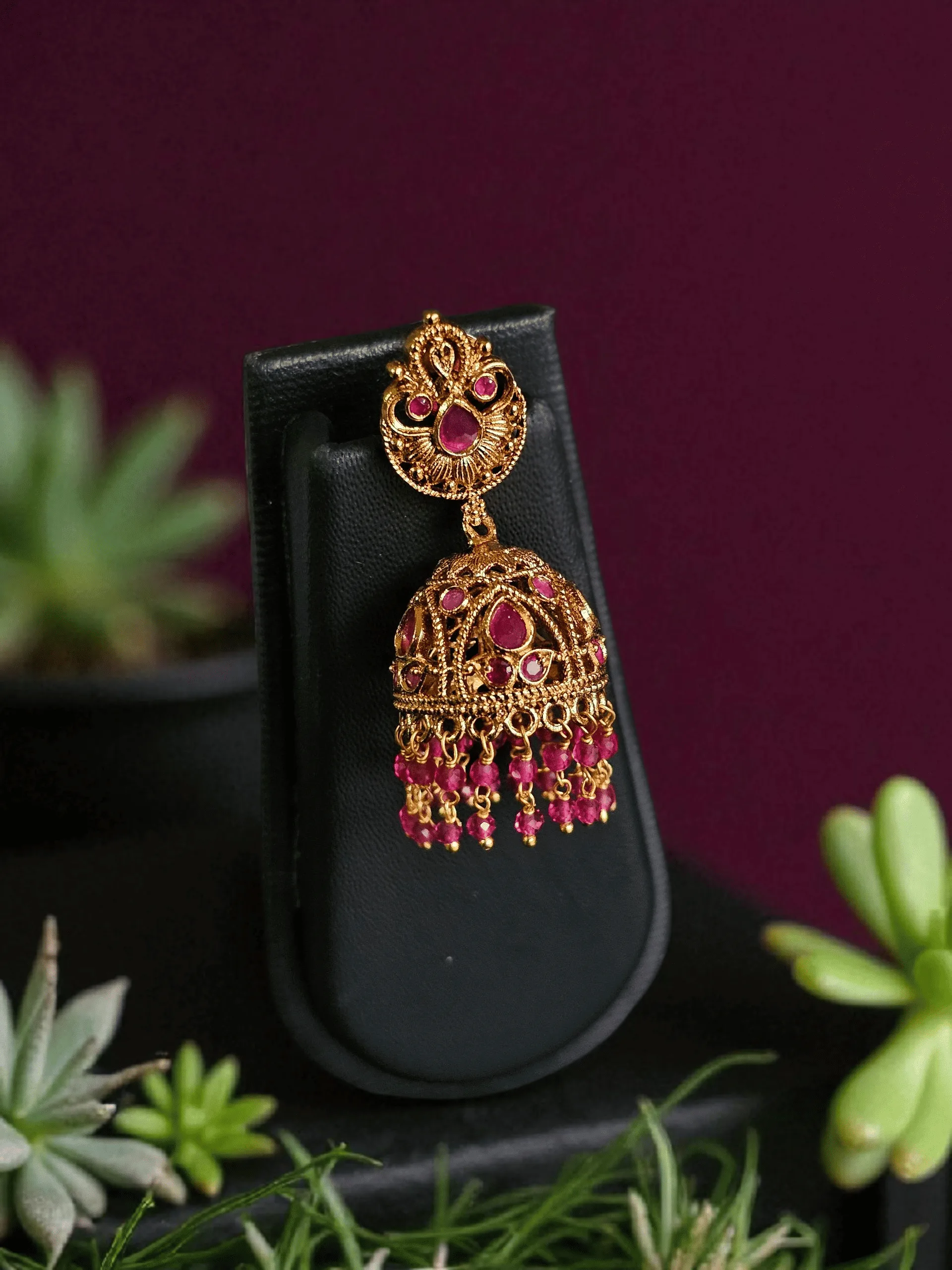 These premium temple jhumkas are beautifully detailed with traditional South Indian motifs and tiny pink bead hangings that move gently as you do.