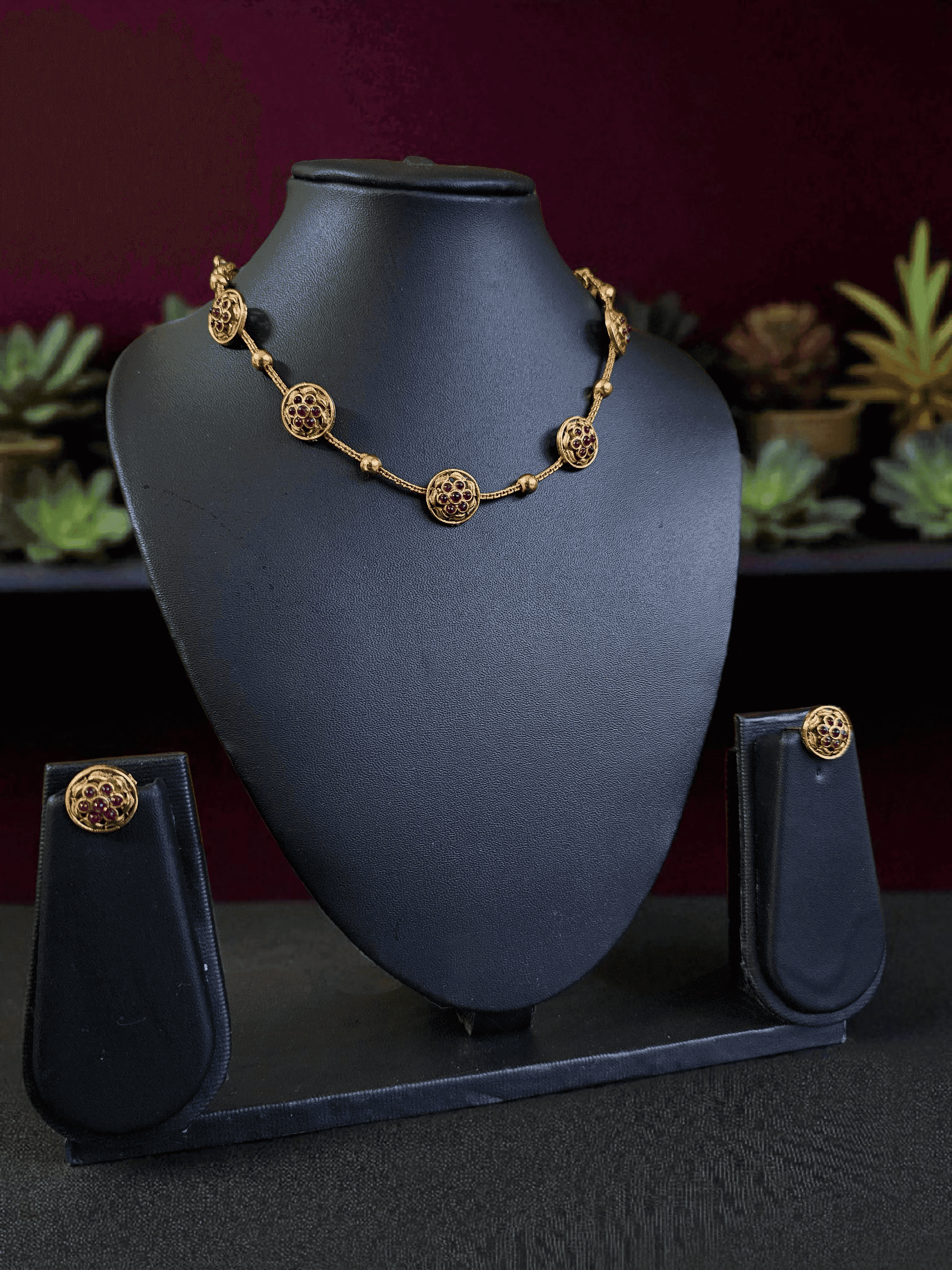 Add a touch of elegance and sparkle with this intricately designed jewellery set, featuring small round shapes engraved with ruby pink stones. The vibrant stones bring a pop of color while the detailed craftsmanship reflects timeless sophistication.