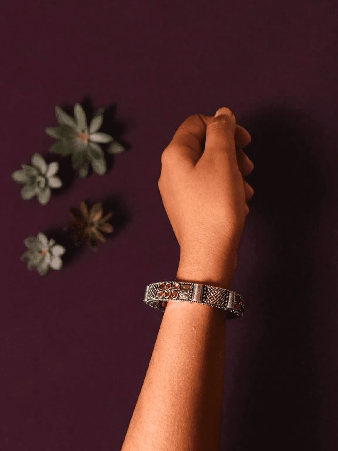 Bring a touch of vintage elegance to your look with these oxidised bangles, featuring ruby pink stones arranged in a delicate flower design. The intricate oxidised finish highlights the craftsmanship, while the floral motif adds a feminine and festive charm.