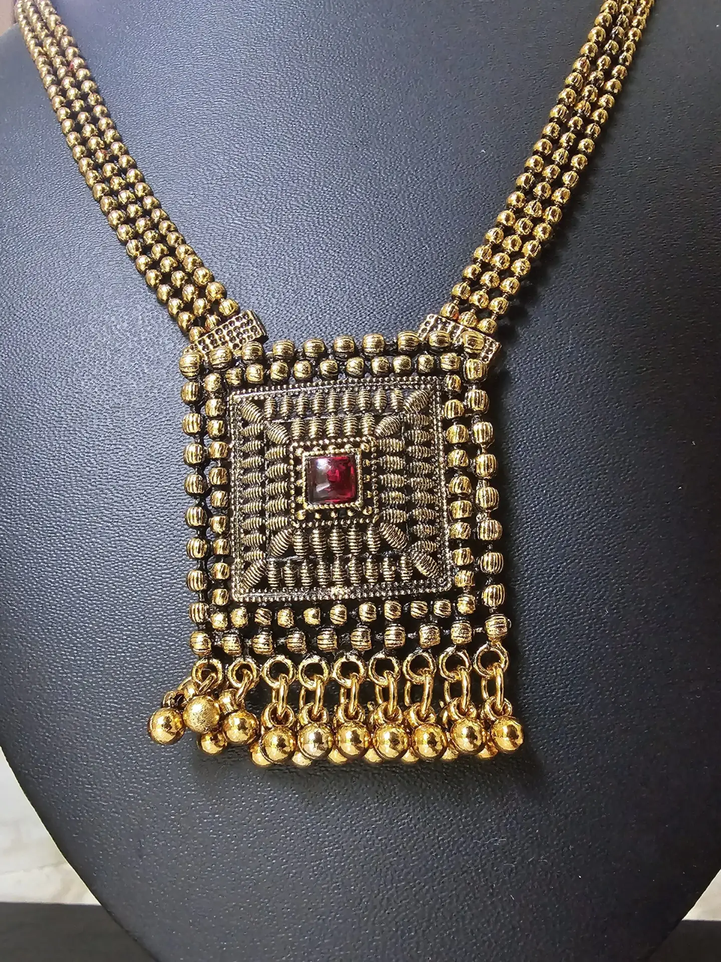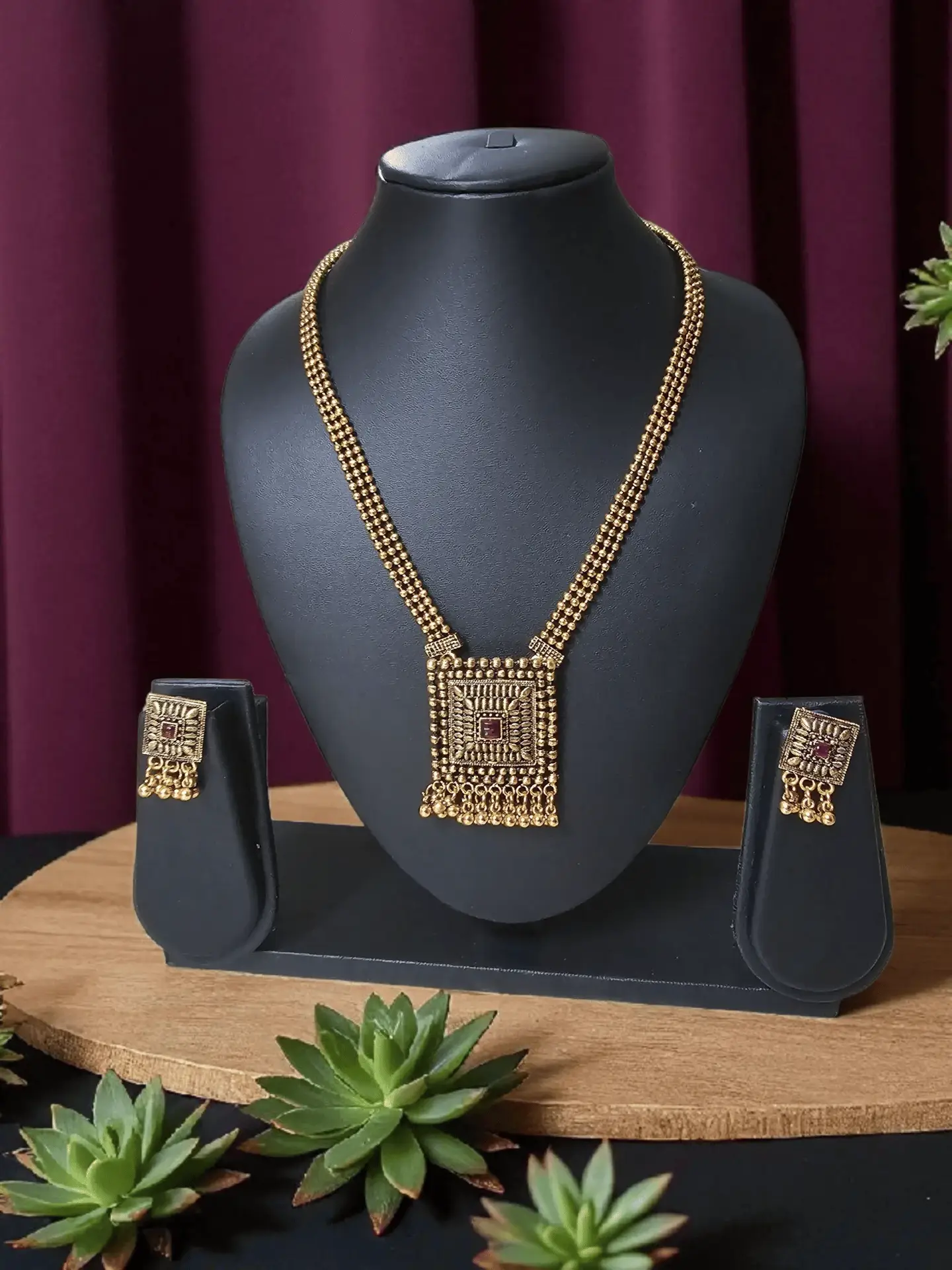 Add a modern twist to your traditional style with this square-shaped pendant jewellery set. The elegant design highlights a ruby pink stone at the center, symbolizing love and grace. Paired with matching earrings, this set strikes the perfect balance between classic charm and contemporary appeal.